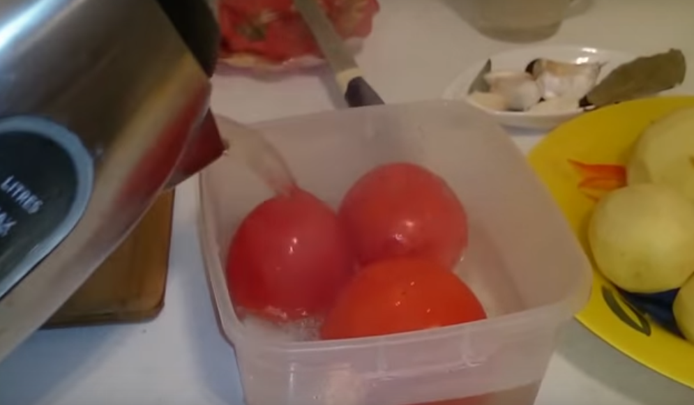 Заливаем помидоры горячей водой и оставляем их на 3-5 минут, для того, чтобы с легкостью можно было снять кожицу.