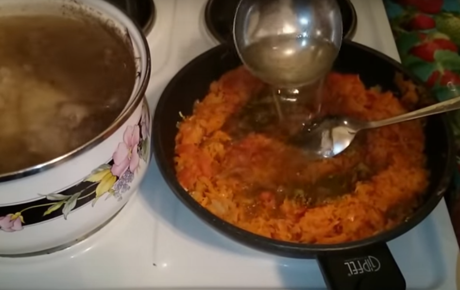 Когда мясо покипит 30 минут, добавляем в него промытый рис и картофель и варим всё вместе 10 минут. Потом добавляем в суп зажарку и варим суп до готовности риса и картофеля. Когда все ингредиенты будут готовы, добавляем в суп зелень, снимаем его с огня и даём настояться под закрытой крышкой 10 минут.