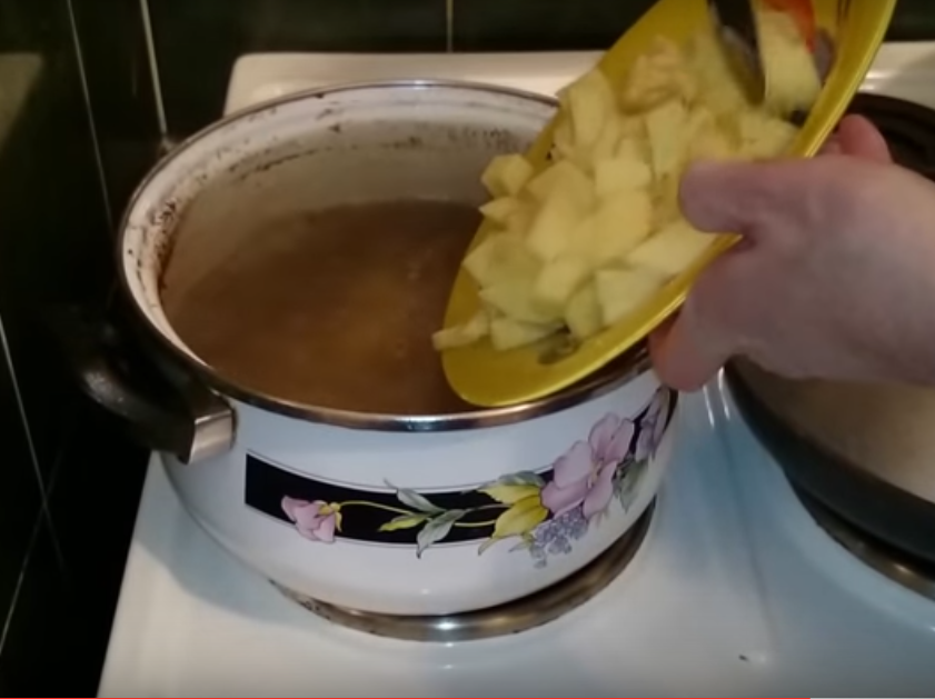 Из кастрюли достаем почти готовый кусок мяса, нарезаем его небольшими кусочками и отправляем обратно в бульон. Туда же спускаем нарезанный небольшими квадратиками картофель и тушенные овощи. Солим по вашему вкусу.