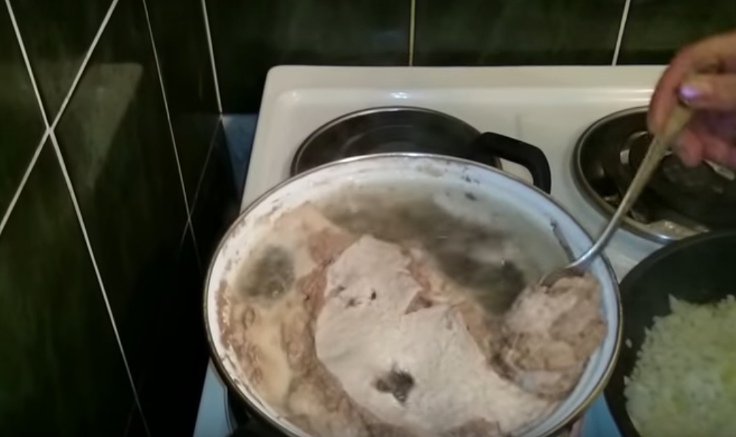 Мясо промываем в проточной воде, нарезаем порционными кусочками и ставим в кастрюле на плиту отваривать.