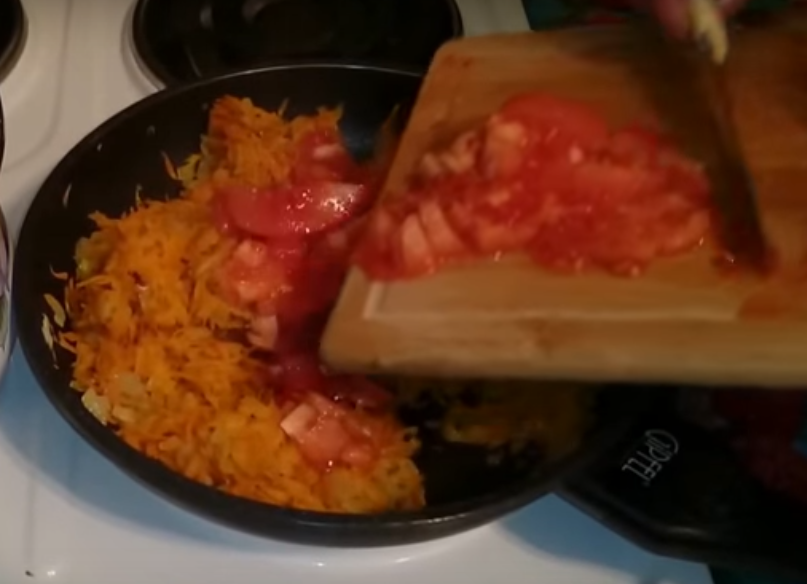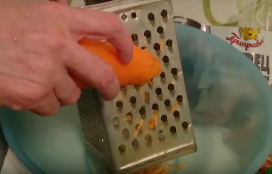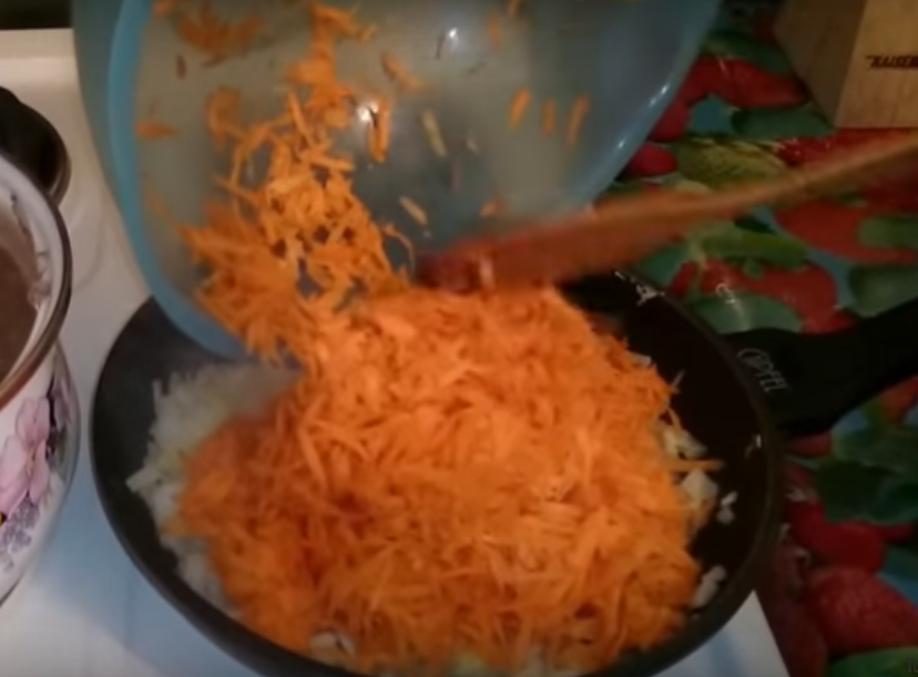 В сковороду к луку перекладываем натертую морковь и продолжаем пасировать