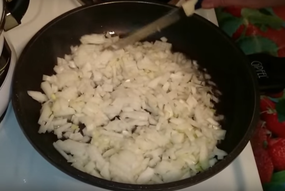 Лук чистим, нарезаем мелкими кусочками и обжариваем в сковороде на растительном масле.