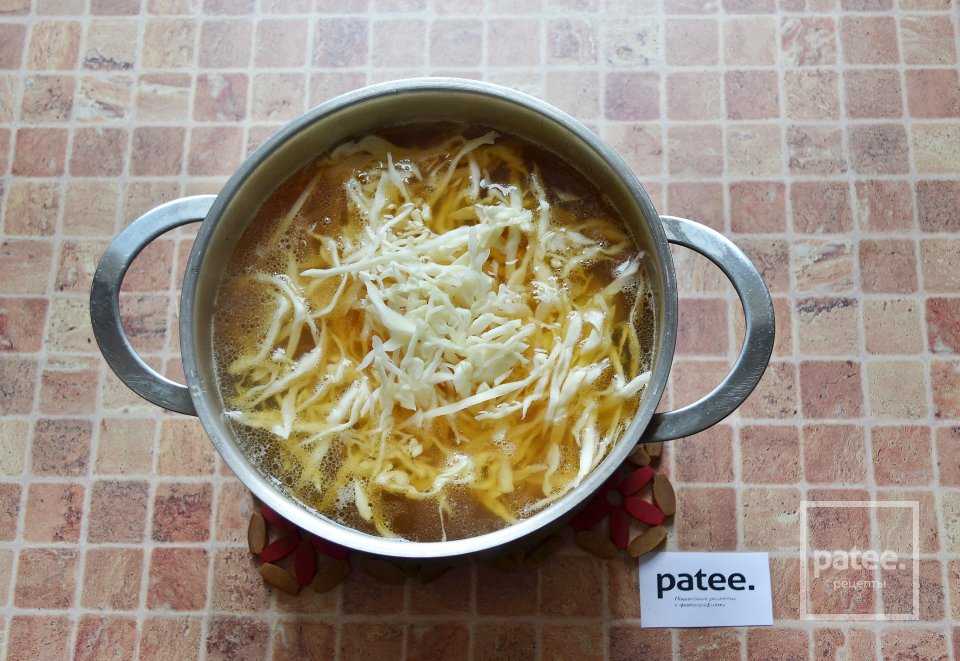 Тонко шинкуем капусту, кладем в бульон и варим 10 минут.