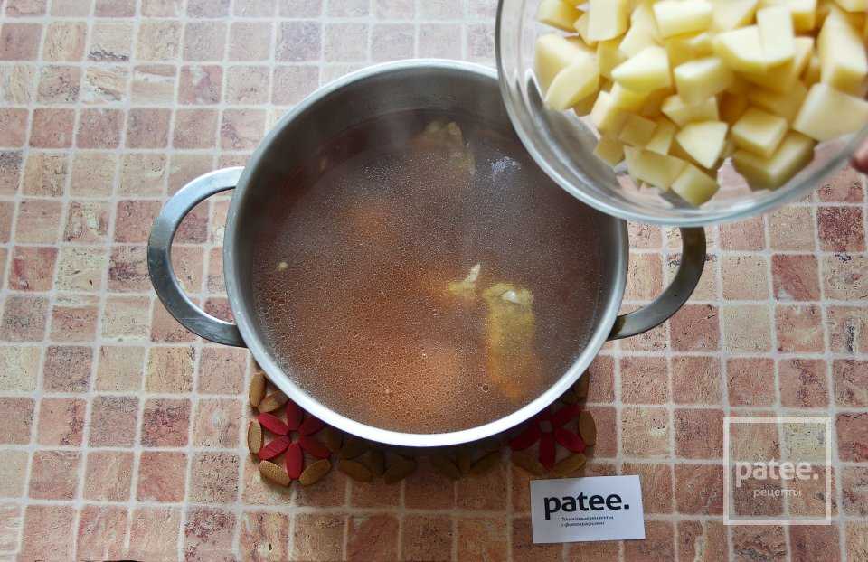 Нарезаем картофель кубиками, кидаем в бульон, готовим 5 минут.