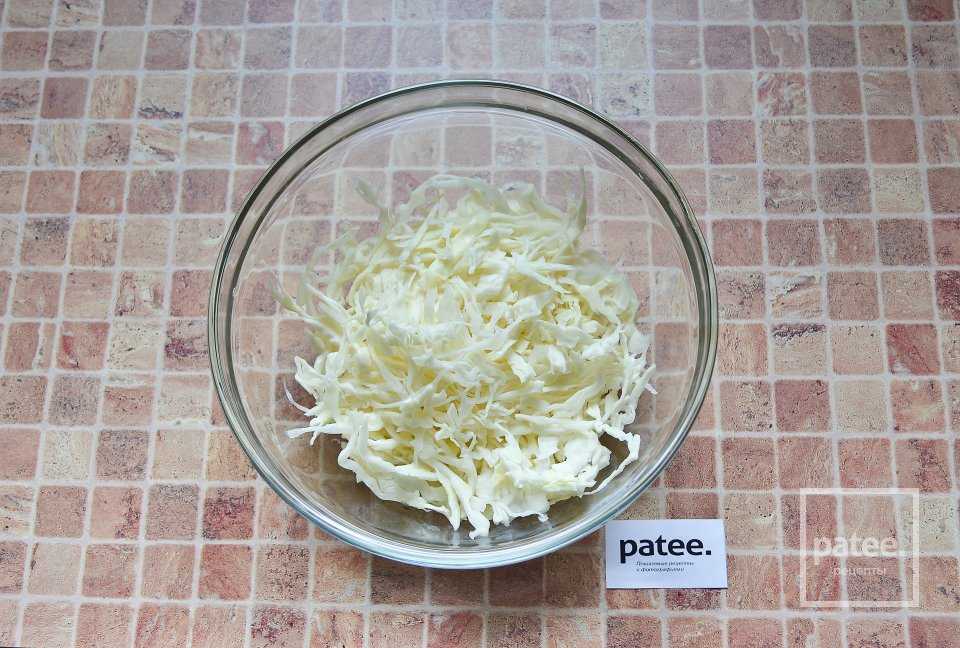 Тем временем нашинкуйте капусту полосочками 3-5 мм.