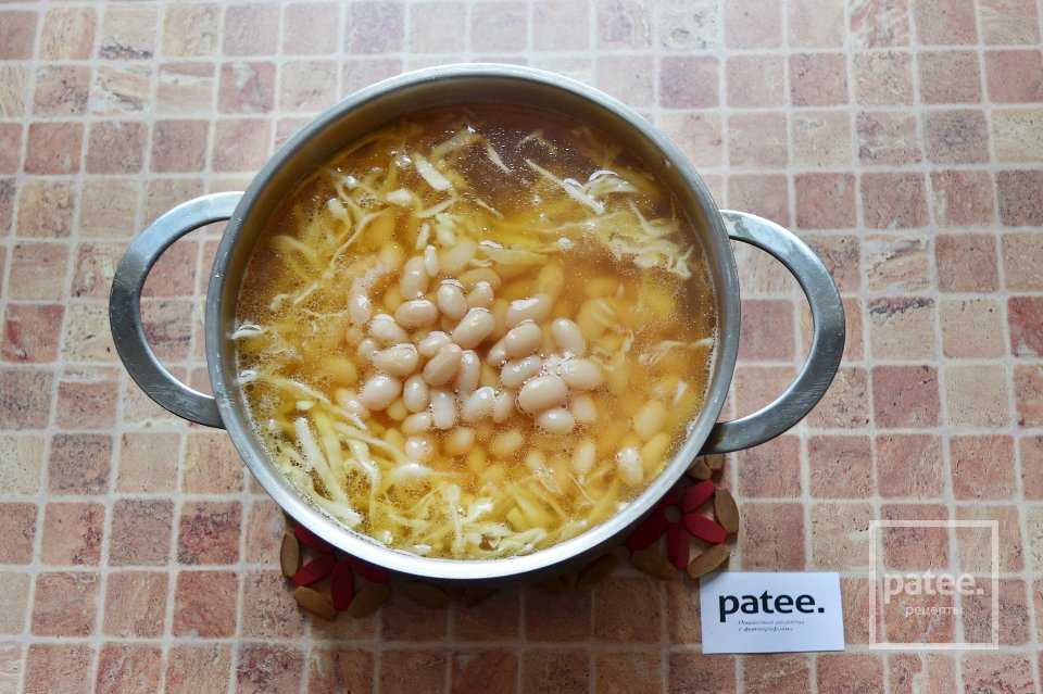 Это наш будущий суп. К фасоли отправьте капусту, картофель и морковку, порезанную соломкой. Доведите бульон до кипения и оставьте под крышкой на 10 минут.
