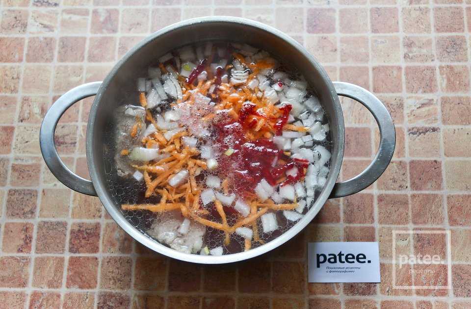 Из оставшейся морковки с луком приготовьте зажарку. Добавив томатную пасту и немного бульона, потушите ее в течение 1-2 минут и тоже пустите в кастрюлю.