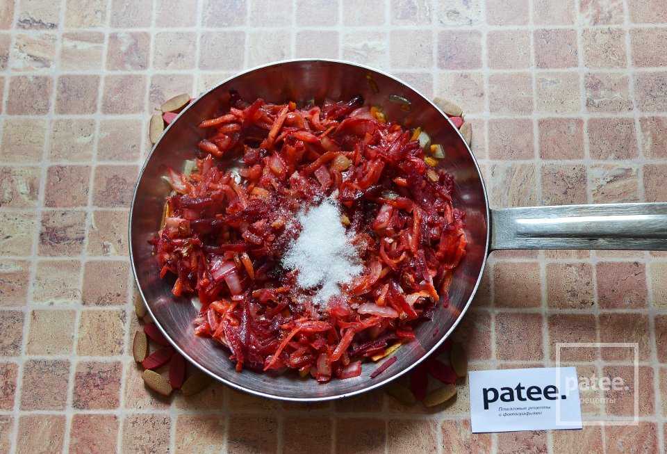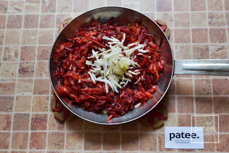 Обжариваем луки морковь вместе со свеклой и чесноком 2-3 минуты.