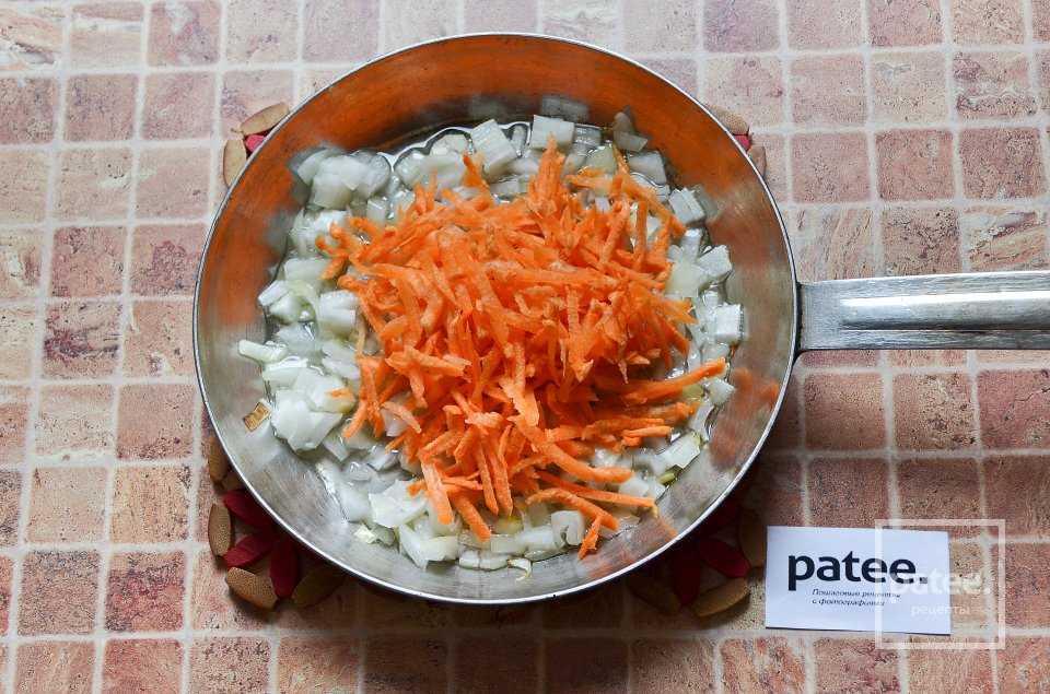 Тем временем займемся зажаркой. Для этого на сковороде с подсолнечным маслом поджарьте весь лук до прозрачности, добавьте всю оставшуюся морковь.