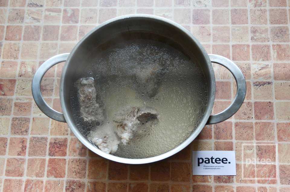 Готовим бульон. Мясо должно быть с прослойкой жира, а лучше брать мясо на кости. Вымойте, залейте холодной водой. Проварите 15-20 мин, первый бульон обязательно слейте.
