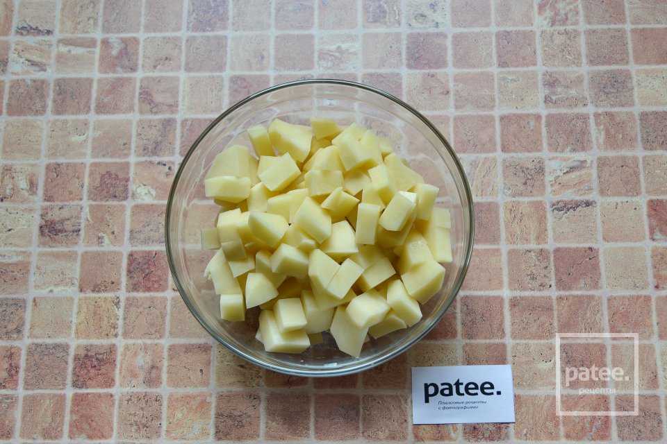 Картофель нарежьте кубиками. Если вам нравятся брусочки, то можете порубить именно так.