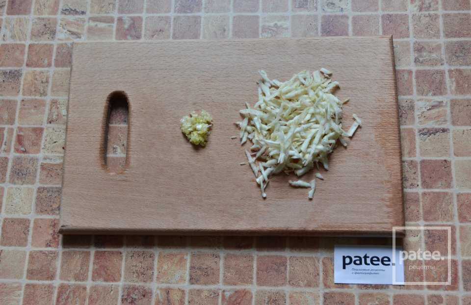 А вторую натрите плюс ко всему сразу же измельчите лук.