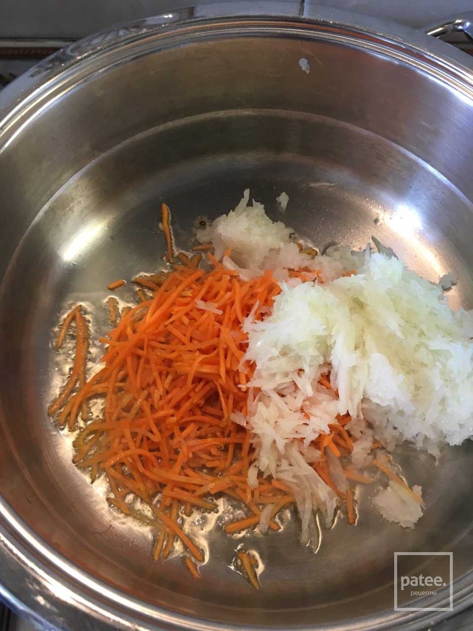 Разогреем оливковое масло и отправим на поджарку тертую соломкой морковь и лук. Чеснок измельчим и добавим к поджарке. Готовим при закрытой крышке пару минут на среднем огне.