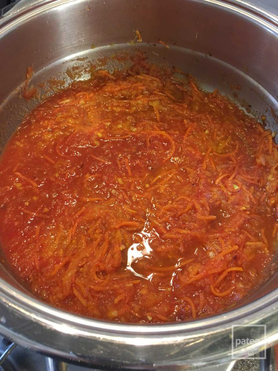 - Морковь и лук положите в сковороду с разогретым маслом, обжарьте до появления золотистого оттенка, добавьте томатную пасту, потушите 5 минут.