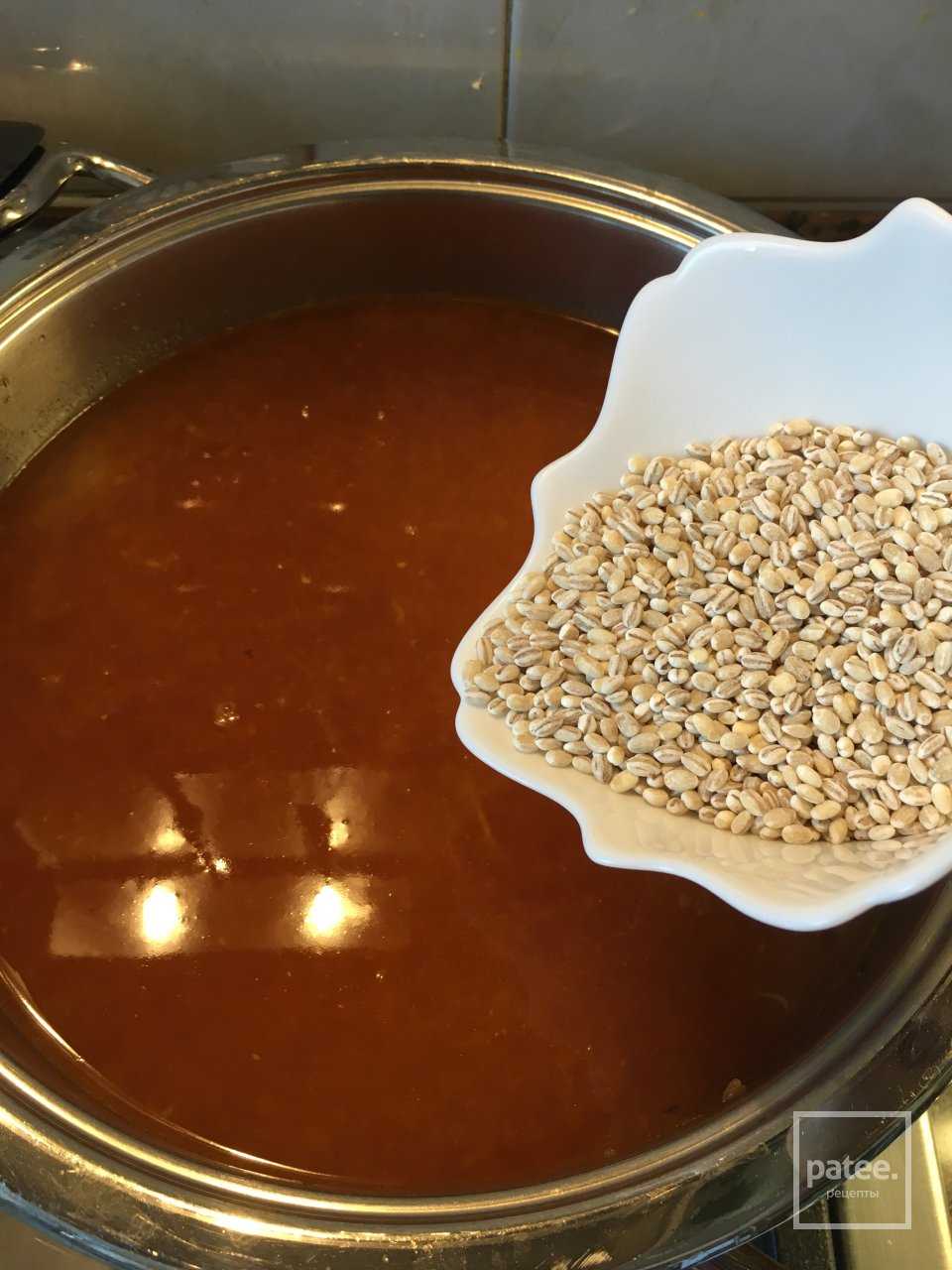 Минут через 20 кипения бульона закладываем перловку.