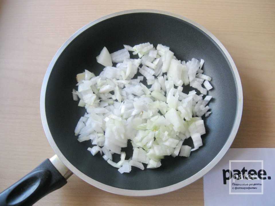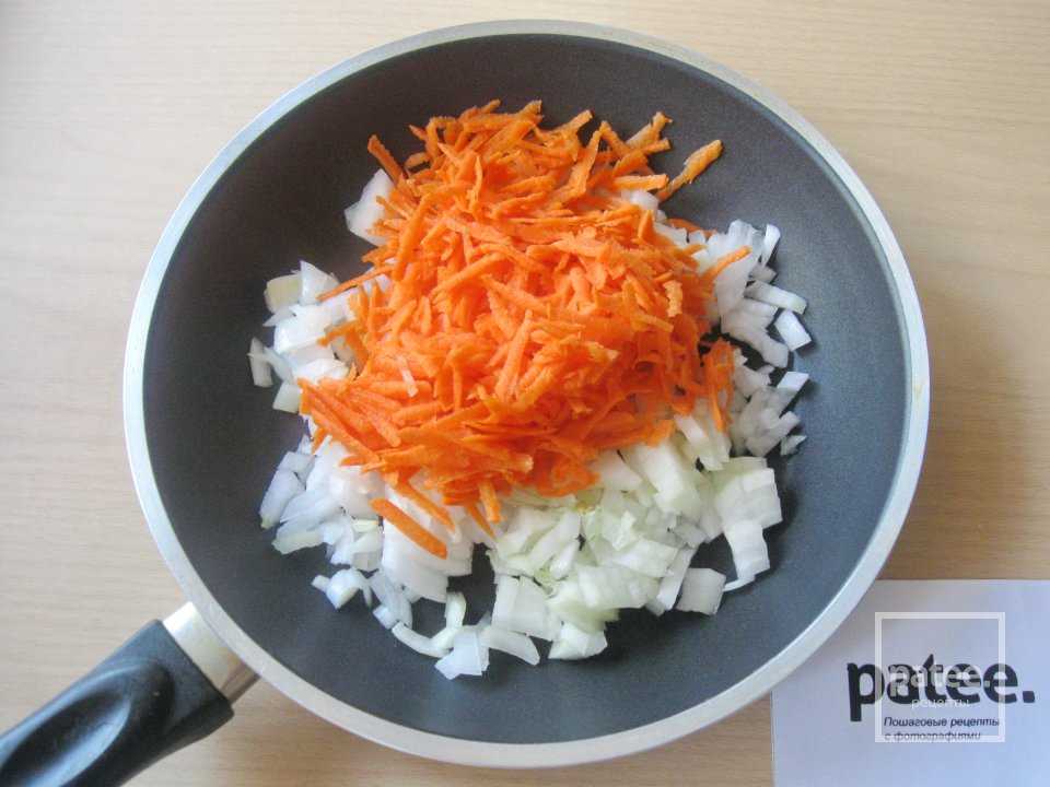 Измельчите вторую половинку лука и морковь, пожарьте до золотистого цвета.