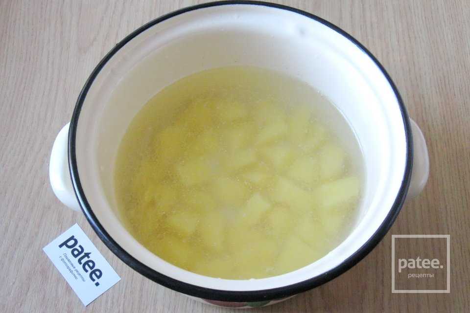 В кастрюлю наливаем бульон(у меня куриный). Кладем нарезанный картофель и ставим её на плиту.