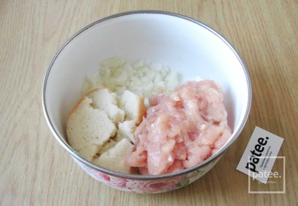 Делаем фрикадельки. Белый батон замачиваем в холодной воде и отжимаем. Лук репчатый чистим, моем и мелко нарезаем. Кладем в миску нарезанный лук, батон и мясной фарш. Фарш может быть любым по вашему вкусу, у меня индюшиный.