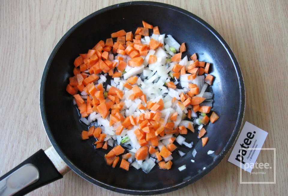 Морковь и репчатый лук очищаем, моем и мелко нарезаем. Морковь можно натереть на терке. Овощи кладем на сковороду с подсолнечным маслом и тушим на небольшом огне 7-10 минут.