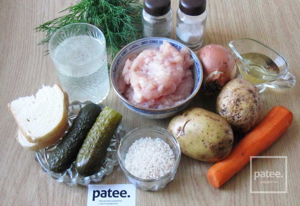 Для приготовления рассольника с фрикадельками потребуются следующие ингредиенты: мясной бульон, картофель, морковь, лук репчатый, рафинированное подсолнечное масло, соленые огурцы, мясной фарш, белый батон, рис, соль, перец черный молотый, зелень.