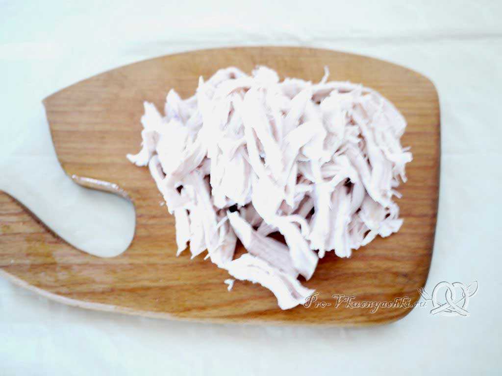 Готовую отварную курицу (через 30 мин после начала варки) вынимаем из кастрюли, остужаем и разбираем на волокна.