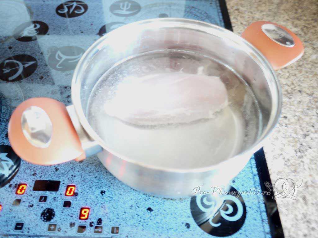Не теряя времени, ставим на максимальный огонь кастрюлю с водой (2 л) и куриным филе (300 г — 1/2 куриной грудки). Доводим до кипения и убавляем мощность до средней, так чтобы не было активного бурления, иначе на поверхности будет образовываться большое количество пены из-за денатурации белка мяса. Если пена все же появилась, уберите ее с помощью шумовки или ложки. Варим бульон в течение 25-30 мин.