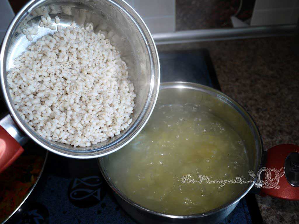 Я не люблю мутный бульон в первых блюдах, поэтому варю перловку отдельно и добавляю ее в уже практически готовый суп. Но это дело каждого.