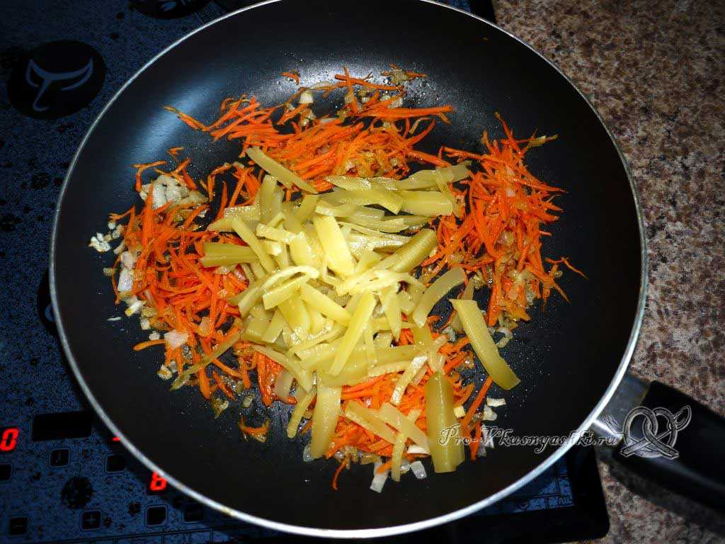 9. Добавьте к морковно-луковой зажарке соленые огурцы, томатную пасту и тушите еще 5 минут.