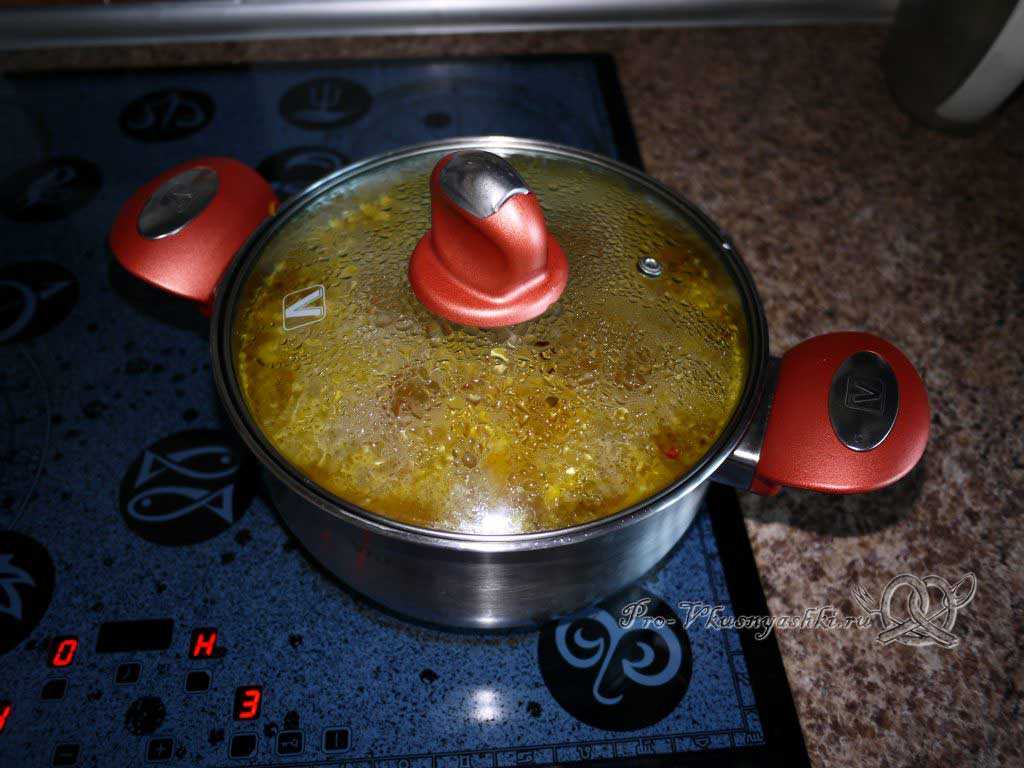 Затем накрываем кастрюлю крышкой и варим суп на малом огне в течение 5-10 мин до готовности картофеля, так чтобы жидкость не выплескивалась на плиту.