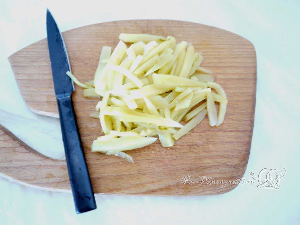 1. Подготовим овощи для рассольника с полбой. Картофель нарежьте небольшой соломкой.