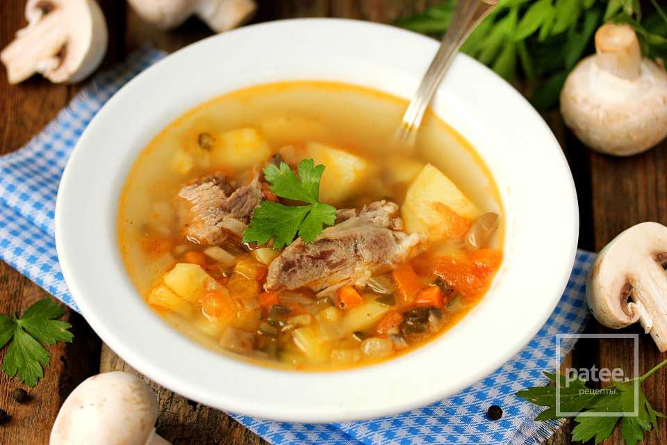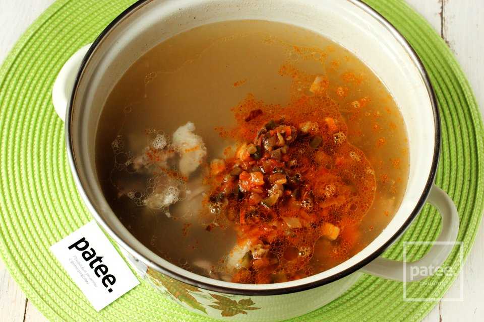 Когда и мясо, и картофель будут готовы, в суп перекладываем зажарку со сковороды. Даём супу закипеть и варим его на медленном огне ещё минут 7, чтобы обжаренные овощи и грибы успели насытить бульон.