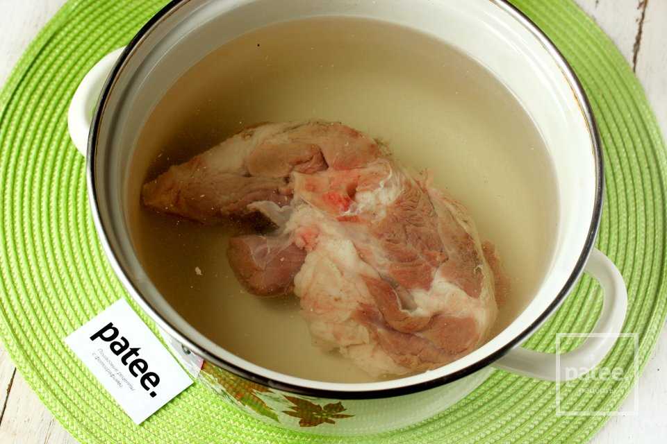Заливаем мясо чистой холодной водой. Ставим кастрюлю на плиту, на сильный огонь. По мере закипания воды снимаем образующуюся пену. Когда вода закипит, убавляем огонь до минимума и варим свинину до полу-готовности.Точное время варки мяса указать сложно — оно напрямую будет зависеть от величины куска (кусков) и качества самого мяса.