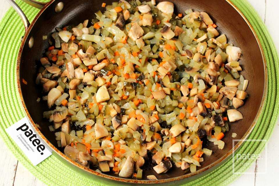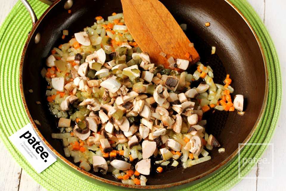 Помешивая, обжариваем овощи и шампиньоны около 5-7 минут.