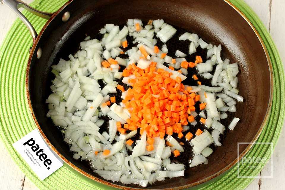 Вслед за луком в сковороду отправляем нарезанную маленькими кубиками морковь. Обжариваем на не сильном огне лук и морковь, периодически помешивая овощи при этом.