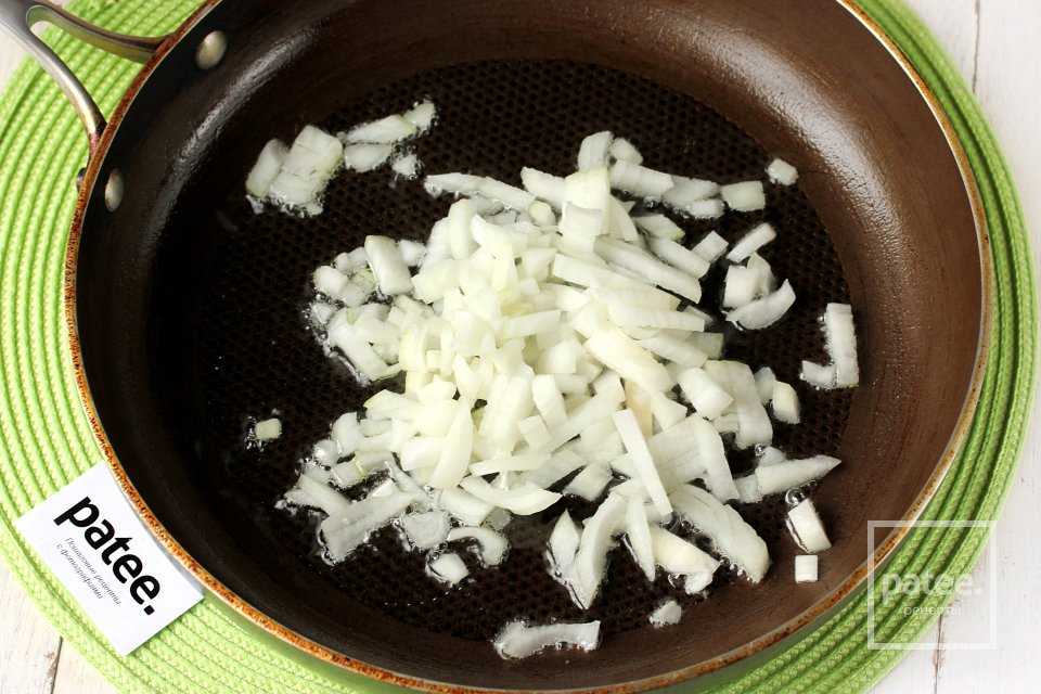 - Берем сковороду, наливаем подсолнечное масло, перекладываем лук, слегка обжариваем на среднем огне.