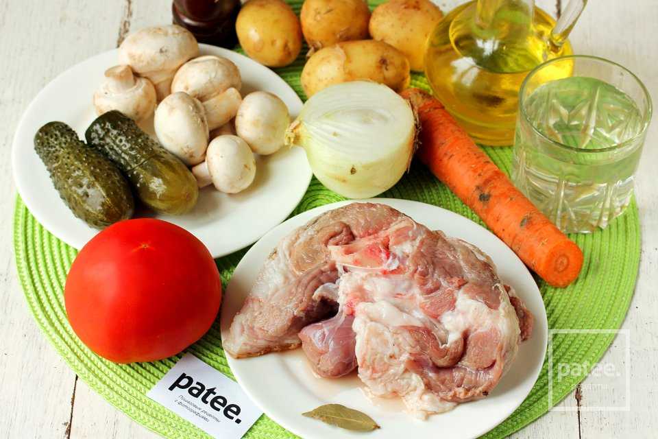 Для приготовления рассольника со свининой и грибами нам понадобятся следующие ингредиенты: свинина, шампиньоны, вода, картофель, солёные огурцы, помидоры или томатная паста, репчатый лук, морковь, масло подсолнечное рафинированное, лавровый лист, соль, чёрный молотый перец.