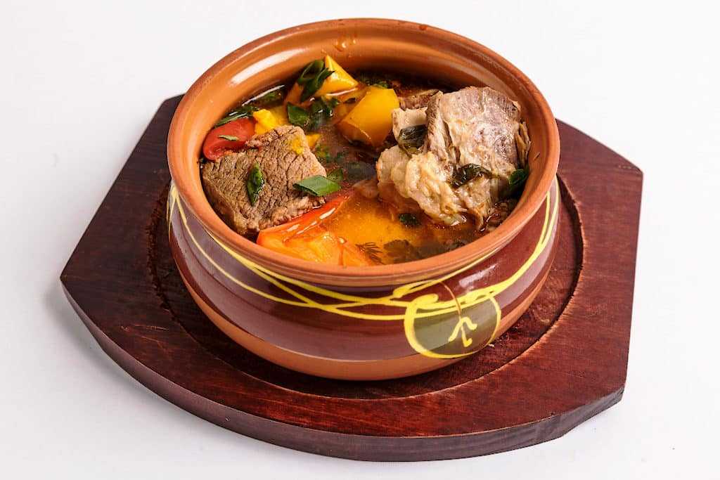 Густой наваристый шулюм с копченостями удивит даже самых привередливых гостей. Для приготовления лучше всего подойдут копченые ребрышки или кусочек грудинки. Бульон нужно варить из сырой свинины. Также в список ингредиентов входят: картофель, помидоры, репчатый лук, болгарский перец, специи.