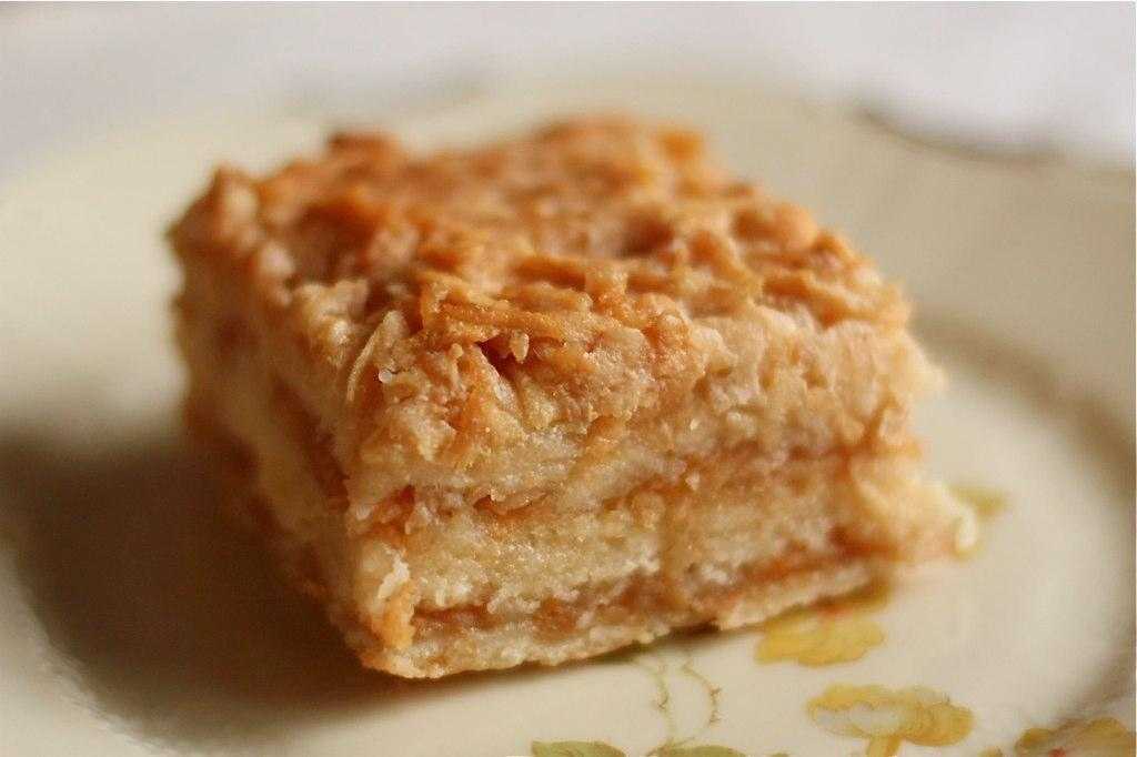 Варшавский яблочный пирог. Ингредиенты: 250 г муки, 250 г сахара, 250 г манной крупы, 2 ч. л. разрыхлителя, по 1 ч. л. корицы и ванильного сахара, 150 г сливочного масла, 1 кг яблок, лепестки миндаля.