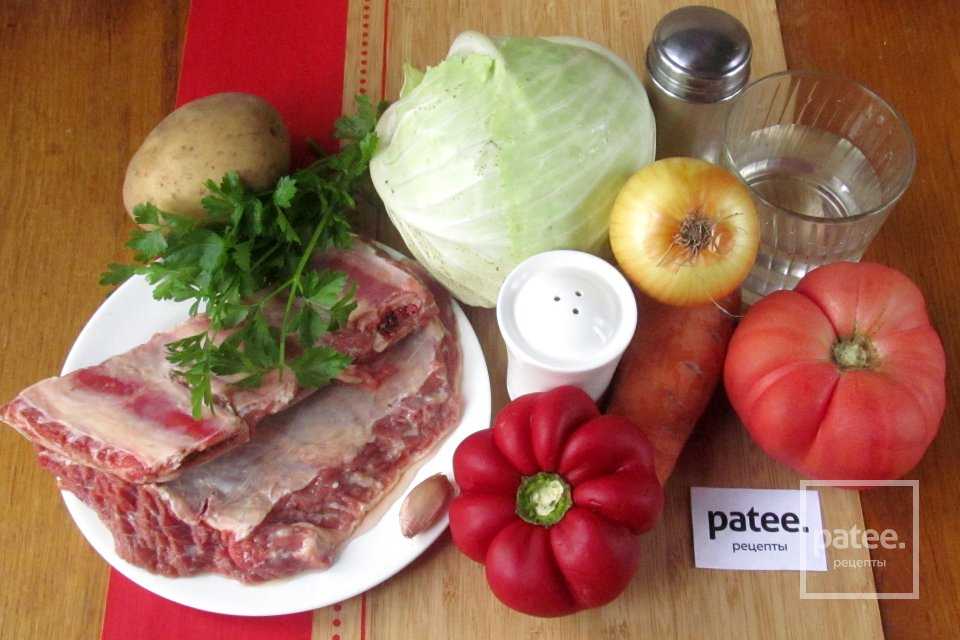 говядина (мясо на кости) – 600г; капуста белокочанная – 200г; помидоры – 2 шт.; морковь – 2 шт.; картофель – 2 шт.; лук репчатый – 2 шт.; пшенка – 70г; паста томатная – 3 ст.л.; перец душистый (горошком) – 1-2 горошина; лист лавровый – 1 шт.; соль –
