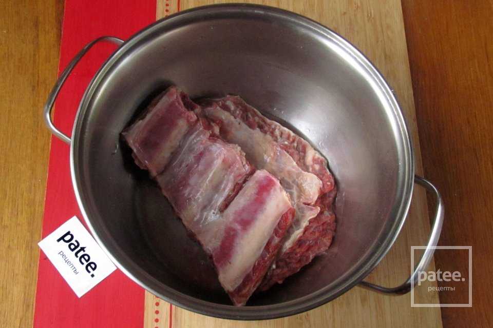 Говяжьи рёбра промываем, перекладываем в кастрюлю. По желанию рёбра можно разрезать на кусочки либо же взять другую часть говяжьей туши.